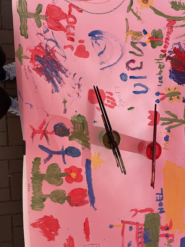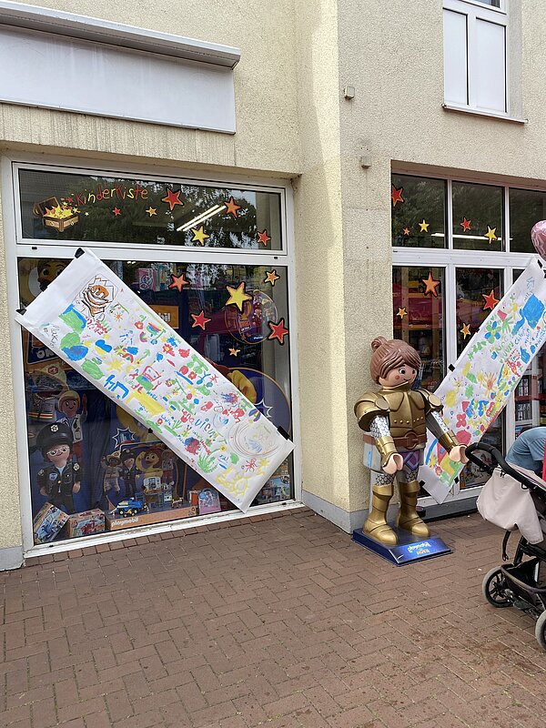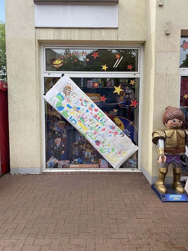 Auch die KinderKiste hat am Sonntag die Kinder mit einer Schaufenstermalerei beschäftigt. Auf einer langen Tapete hat jedes Kind einen Frühlingsgruß da gelassen.