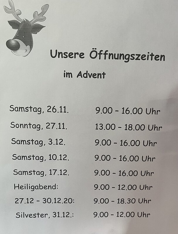 Die Adventszeit kommt rasant näher. Wir haben an den Aventssamstagen bis 16 Uhr auf. Unter der Woche haben wir weiter von 9.00-18.30 Uhr durchgängig geöffnet.